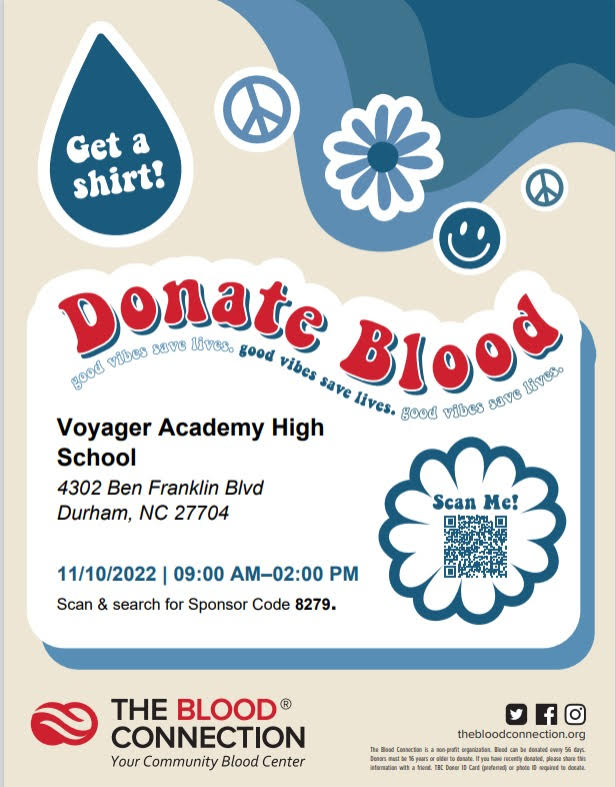 Would you like to donate blood? If so, come to Voyager Academy High School on Nov. 10th, between 9am and 2pm. Hope to see you there! (Details below)